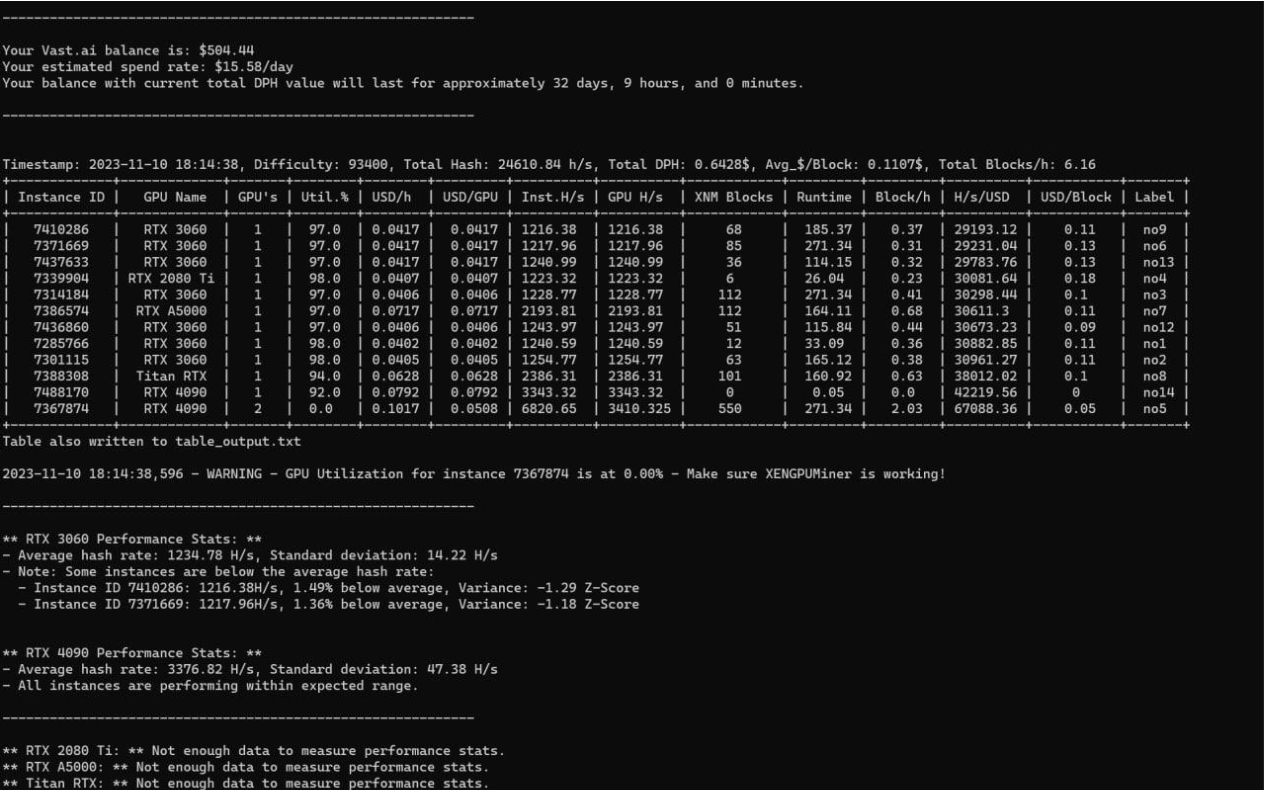 To begin mining, users simply need to deploy the mining script and monitor its efficiency over time. An important metric for assessing mining efficiency is h/s/usd, which measures the number of hashes generated per second relative to the cost incurred. Upon successfully solving a hash and discovering a block, the X1 network confirms its validity and rewards the miner with XNM for each block found.