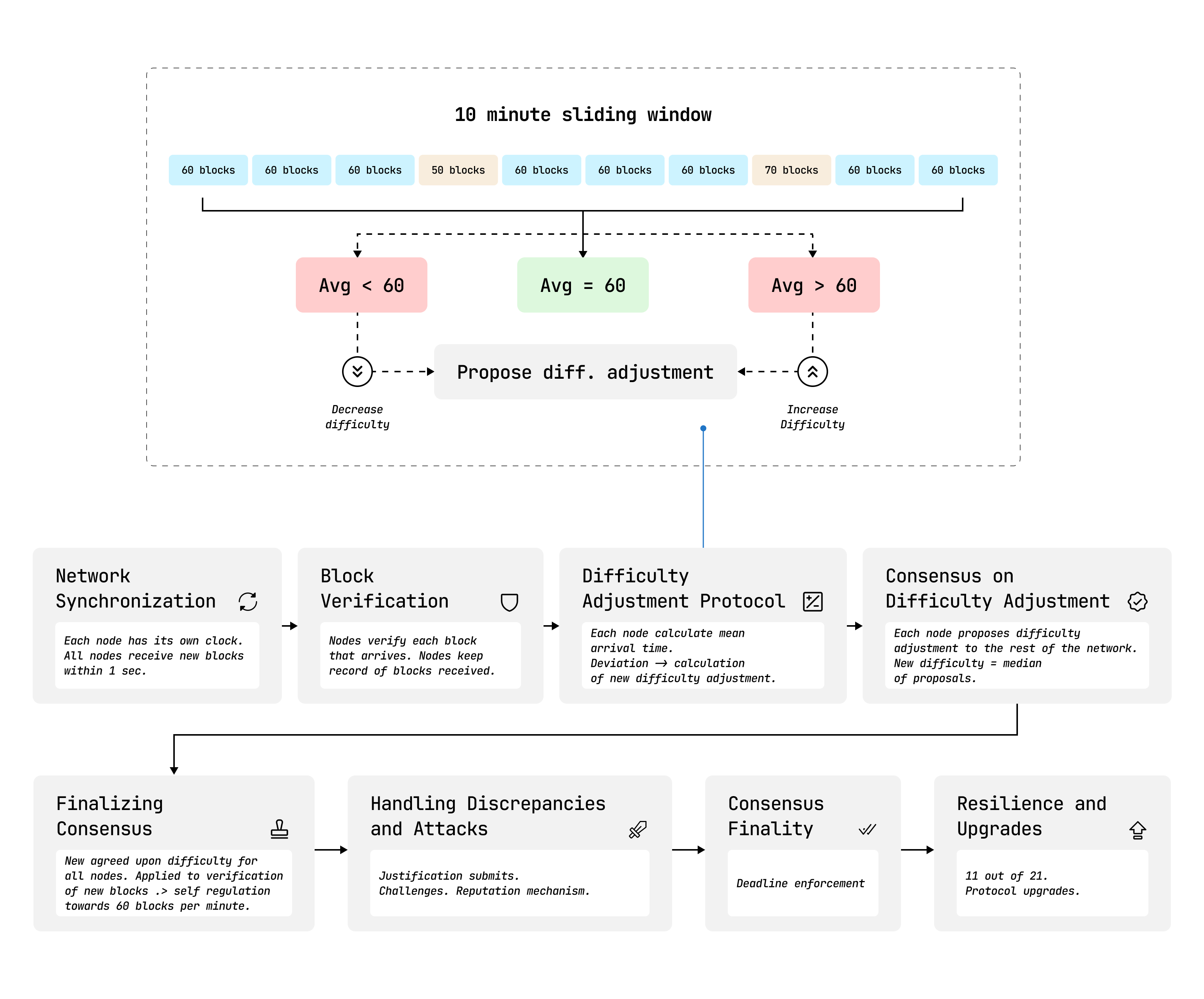 Before implementing the new difficulty setting, the network undergoes a verification phase to prevent attacks and errors. Once this phase concludes and consensus is achieved, the updated difficulty is applied across the network.