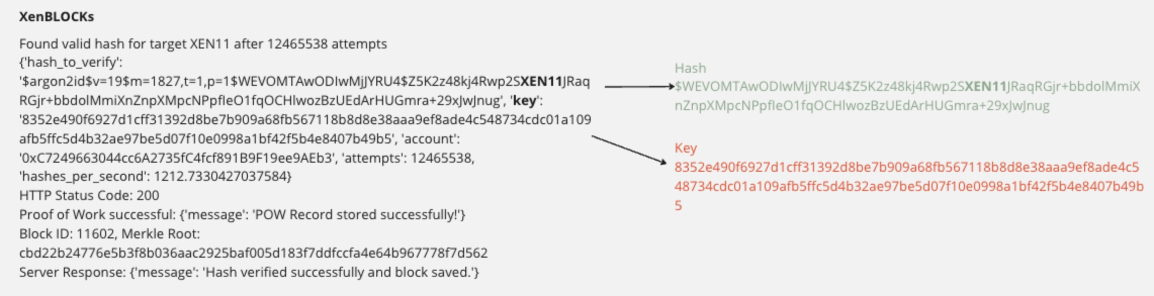 Hashing involves your computer making numerous attempts at discovering a specific hash. The server employs an algorithm to look for a hash that contains "...XEN11...". When your mining device identifies a sequence of 65 characters that contain 'XEN11' within the hashes, a XenBlock is recognized as found.